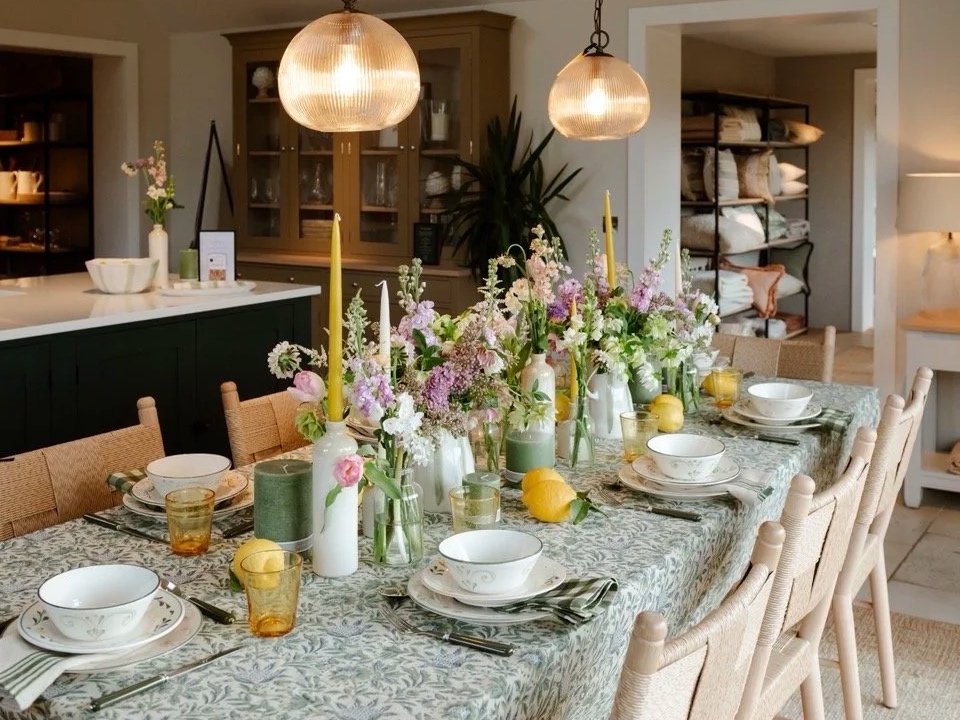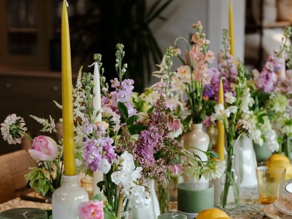Freshly sprung florals arranged to whisper, not shout — designed to sit perfectly alongside the new tabletop accessories and enhance the overall aesthetic without stealing the spotlight. Think soft, seasonal blooms in gentle palettes: pastel lilac, pale ranunculus, blushing tulips and scented stocks., paired with wispy foliage and textured stems to mirror the materials and shapes of the pieces on display.