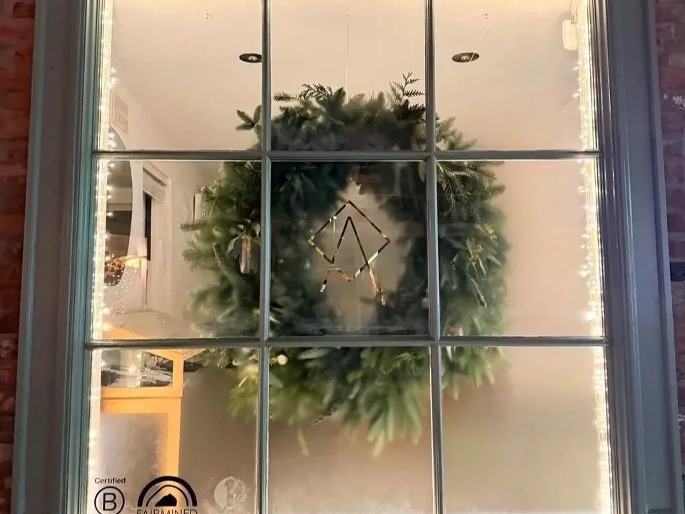 We loved creating this large wreath for Anuka's Christmas window display — a perfectly balanced halo of fresh greenery that frames the window and putting the spotlight on Anuka’s products.. Lush fir and sprigs of winter foliage are woven together.