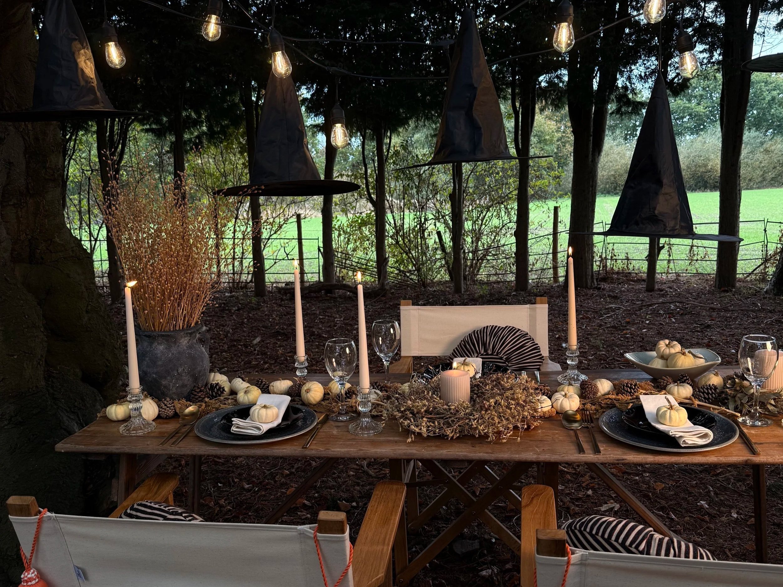 A monochrome Halloween tablescape in the country gardens of Mercure Hotel, Cheshire — white gourds, form the base and dried florals added a warm texture to the space. Floating witch hats gave the scene a playful, magical lift. Festoon lights threaded through overhead branches and wound along the table’s centre casted a warm, honey glow that contrasts beautifully with the pale elements.